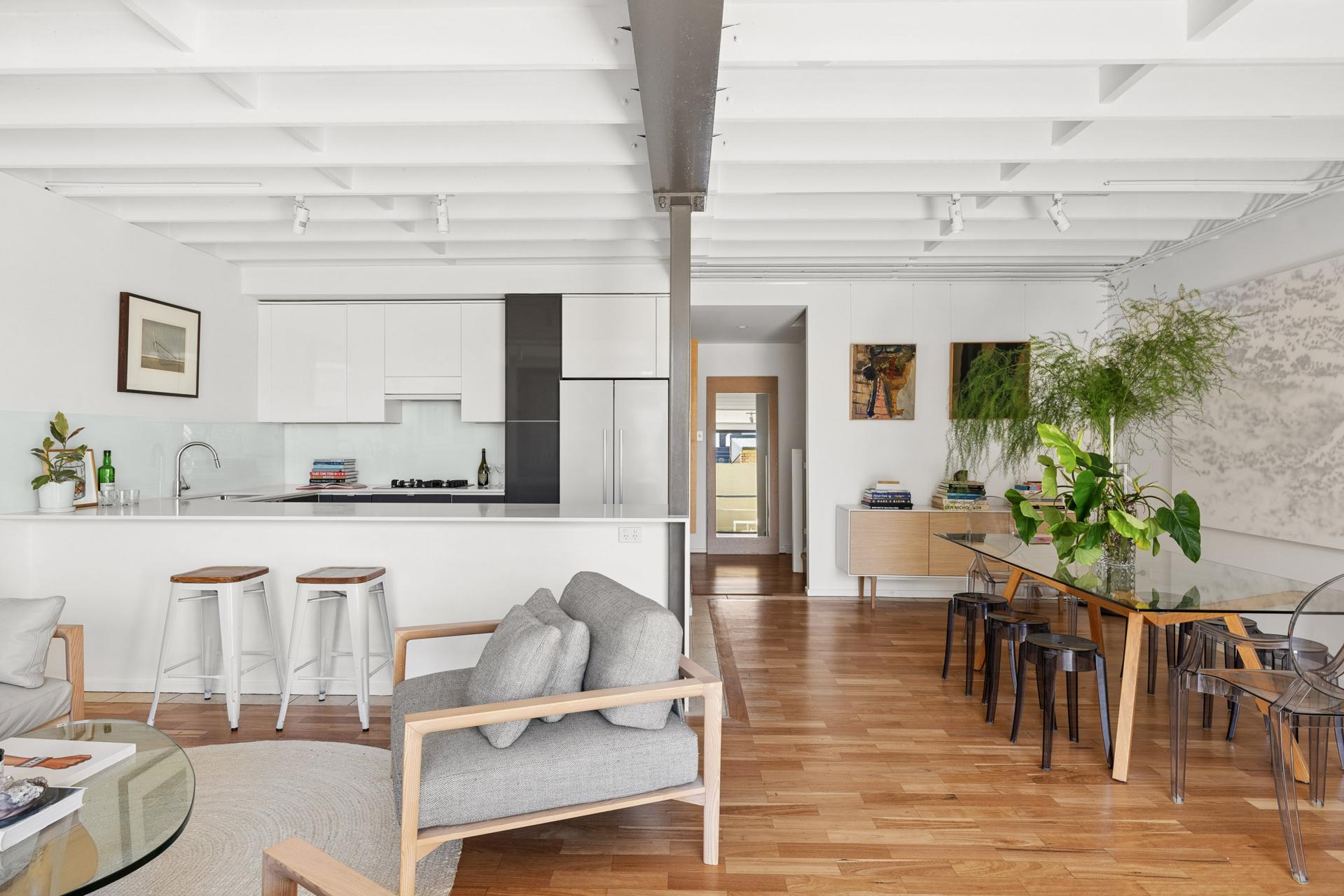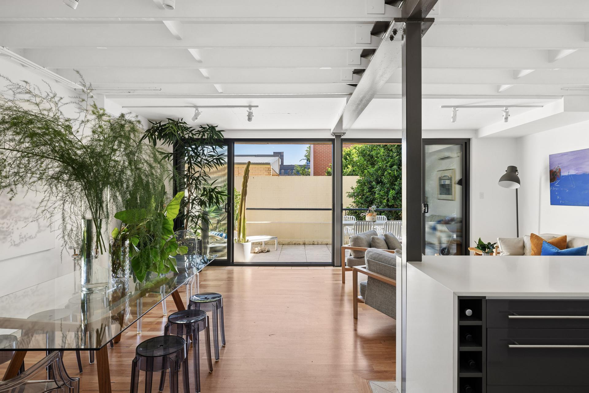 Directly opposite Camperdown Commons and set quietly to the rear of a boutique collection, this expansive residence delivers a rare fusion of warehouse character and refined contemporary design. Renovated by its owners as a long-term home, every detail reflects a commitment to quality - from high-end finishes to extensive custom joinery, creating a space that is both highly functional and beautifully resolved. Generous proportions and an 8m-wide frontage allow for exceptional light, flow and flexibility, with multiple living zones and three spacious bedrooms plus a self-contained studio/ 4th bedroom. The north-facing terrace is designed for entertaining, complete with a retractable awning, while elevated levels capture leafy district outlooks. Balancing architectural presence with lifestyle ease, the home sits moments from parklands, village cafés and the vibrant village life of Newtown and Annandale.