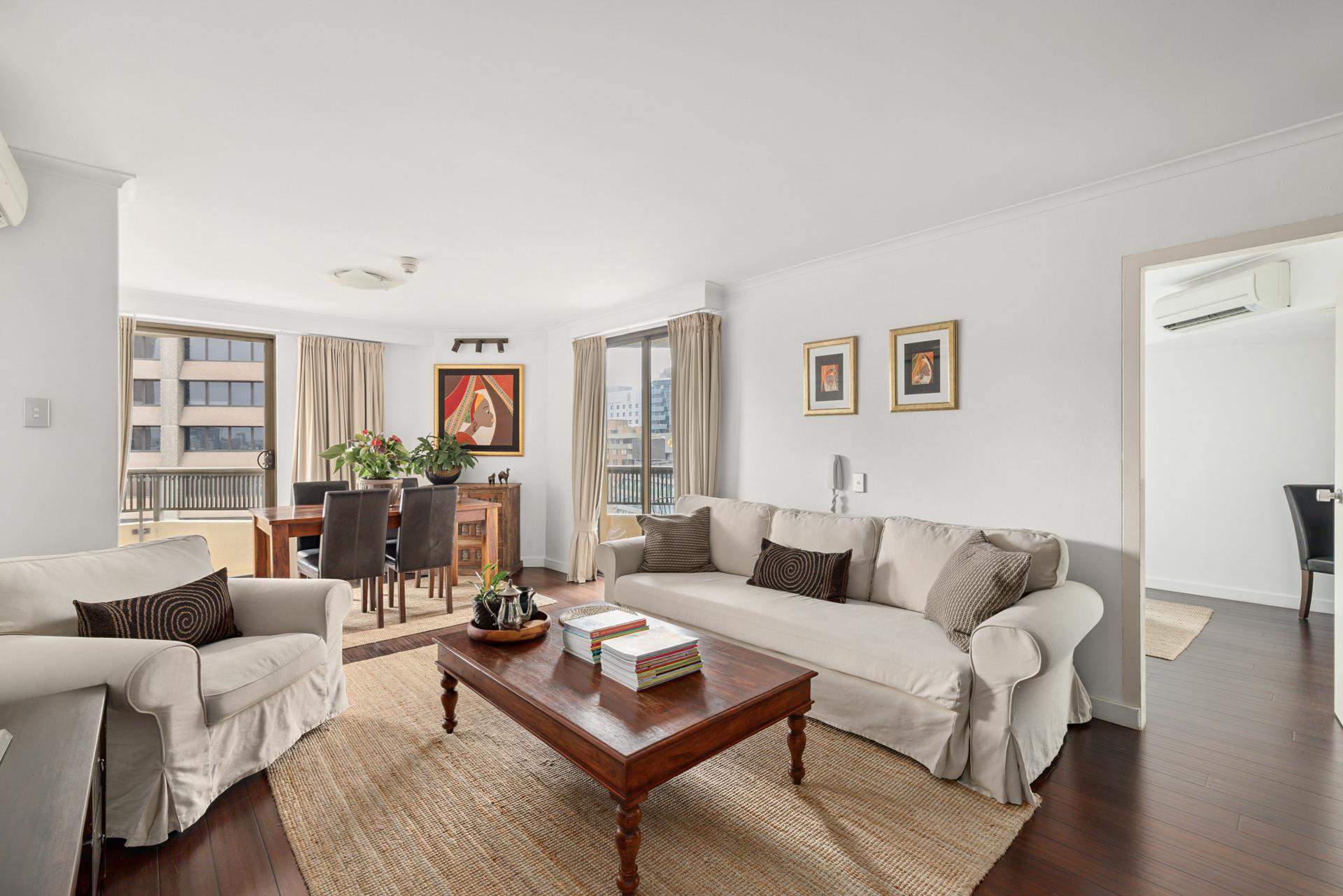 - Open living, dual balconies, floorboards